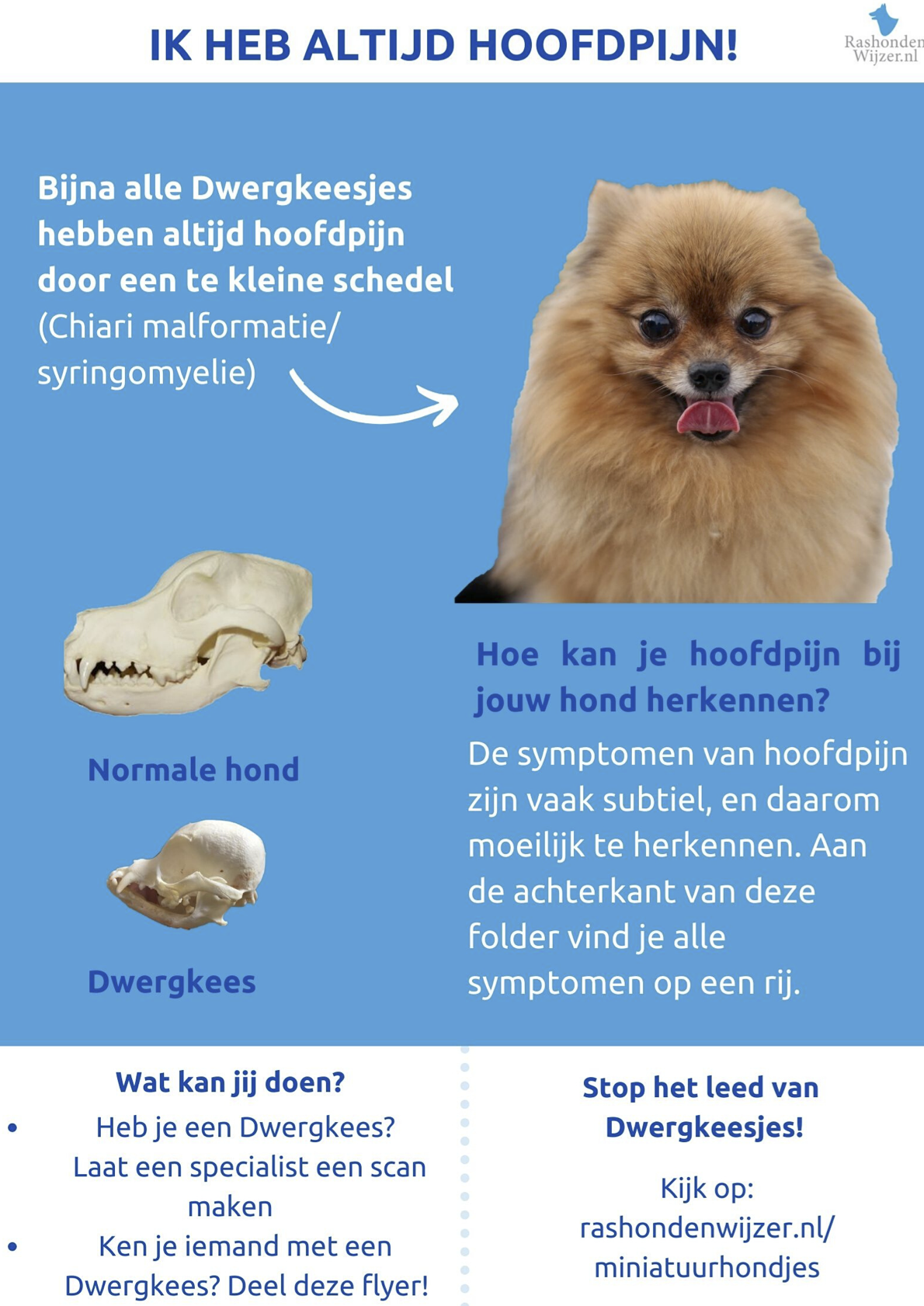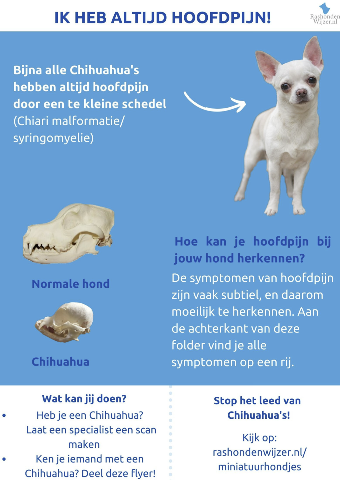 Help mee en wijs mensen erop dat hun hondje waarschijnlijk hoofdpijn heeft, met behulp van de folders. Je vindt ze hieronder.