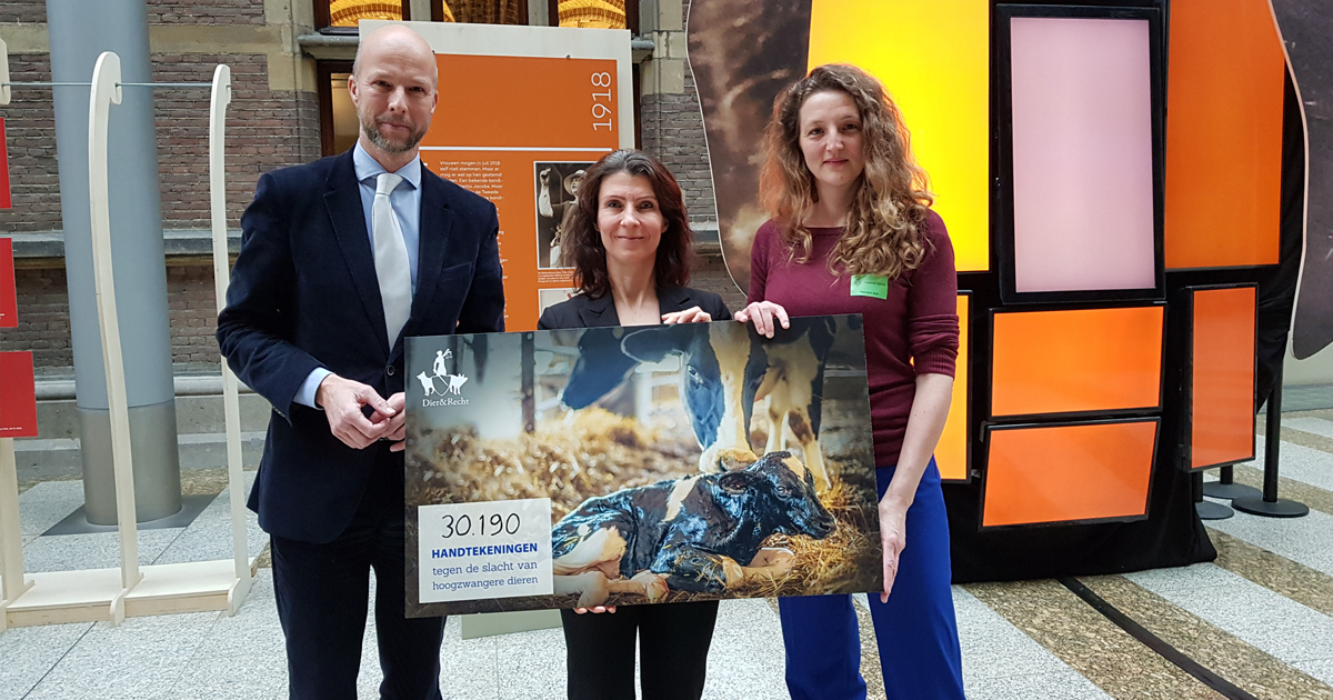 Vanmorgen, 24 januari, heeft Dier&Recht de petitie tegen het slachten van drachtige dieren aangeboden in Den Haag. Namens de Tweede Kamerleden namen Esther Ouwehand (PvdD) en Tjeerd de Groot (D66) de petitie in ontvangst. Meer dan 30.000 mensen hebben de petitie ondertekend!