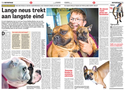 In de Telegraaf verwijst dierenarts Kelly Kessen naar de overgangsregeling voor het fokken van honden met een korte snuit: “Op termijn moet de neus de helft van de schedellengte hebben. Voordat we zover zijn met de Franse bulldogs en de mopshonden zijn we weer even verder, vandaar die ‘overgangsnorm’ van een derde neuslengte. Dat is om ervoor te zorgen dat er überhaupt nog met deze dieren gefokt kan worden.”
