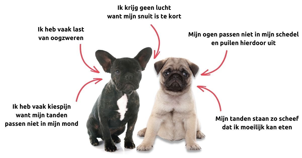 Veel mensen vinden honden mopshonden en Franse bulldogs met een korte snuit schattig vanwege het koddige uiterlijk en hun gesnurk. Dit snurken is echter niet schattig, maar zielig. Het geluid wordt veroorzaakt door geblokkeerde luchtwegen en is een symptoom van de ernstige ademnood. De korte snuit en de kenmerkende gedrongen bouw veroorzaken nog tal van andere gezondheidsproblemen.