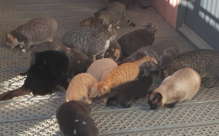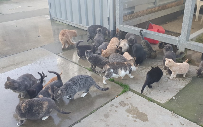 Een groep zwerfkatten in tijdelijke opvang.