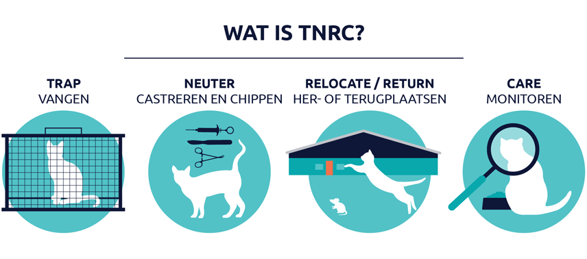 TNRC is een afkorting voor het Engelse trap, neuter, relocate/return en care. In het Nederlands maken we ervan: vangen, castreren, her- of terugplaatsen en monitoren. Dat is een dier- en natuurvriendelijke manier om de populatie zwerfkatten te beheersen.