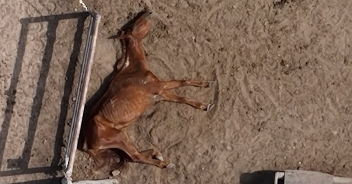 Zieke, uitgehongerde paarden in de verzengende hitte